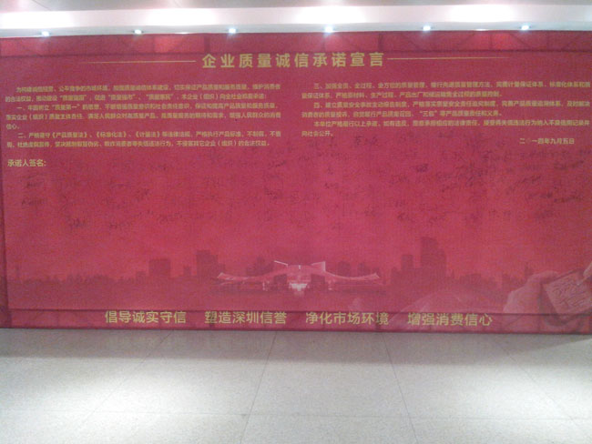 大會(huì)的高潮部分是所有與會(huì)的企業(yè)代表與政界代表一起舉起右手,宣讀《企業(yè)質(zhì)量誠(chéng)信承諾書(shū)》:為構(gòu)建誠(chéng)信經(jīng)營(yíng)、公平競(jìng)爭(zhēng)的市場(chǎng)環(huán)境,加強(qiáng)質(zhì)量誠(chéng)信體系建設(shè),切實(shí)保證產(chǎn)品質(zhì)量,維護(hù)消費(fèi)者的合法權(quán)益,推動(dòng)建設(shè)“質(zhì)量強(qiáng)國(guó)”,促進(jìn)“質(zhì)量強(qiáng)市”、“質(zhì)量惠民”。本企業(yè)向社會(huì)鄭重承諾:一、牢固樹(shù)立“質(zhì)量第一”的思想,不斷增強(qiáng)質(zhì)量意識(shí)和社會(huì)責(zé)任意識(shí),保證和提高產(chǎn)品質(zhì)量,落實(shí)企業(yè)質(zhì)量主體責(zé)任,滿(mǎn)足人們?nèi)罕妼?duì)高質(zhì)量產(chǎn)品的期待和需求,增強(qiáng)人民群眾的消費(fèi)信心。二、嚴(yán)格遵守《產(chǎn)品質(zhì)量法》、《標(biāo)準(zhǔn)化法》、《計(jì)量法》等法律法規(guī),嚴(yán)格執(zhí)行產(chǎn)品標(biāo)準(zhǔn),不制假、不售假,杜絕虛假宣傳,堅(jiān)決抵制假冒偽劣、欺詐消費(fèi)者等失信違法行為,不侵害其他企業(yè)合法權(quán)益。三、加強(qiáng)全員、全過(guò)程、全方位的質(zhì)量管理,推行先進(jìn)質(zhì)量管理方法,完善計(jì)量保證體系、標(biāo)準(zhǔn)化體系和質(zhì)量保證體系,嚴(yán)格原材料,生產(chǎn)過(guò)程、產(chǎn)品出廠(chǎng)和儲(chǔ)運(yùn)銷(xiāo)售全過(guò)程的照顧質(zhì)量控制。四、建立質(zhì)量安全事故主動(dòng)報(bào)告制度,嚴(yán)格落實(shí)質(zhì)量安全責(zé)任追究制度,完善產(chǎn)品質(zhì)量追溯體系,及時(shí)解決消費(fèi)者的質(zhì)量投訴,自覺(jué)履行產(chǎn)品質(zhì)量召回、“三包”等產(chǎn)品質(zhì)量責(zé)任和義務(wù)。本單位嚴(yán)格履行以上承諾。如有違反,愿意承擔(dān)相應(yīng)的法律責(zé)任,接受將失信違法行為納入不良信用記錄并向社會(huì)公開(kāi)。二0一四年九月五日