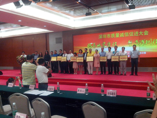 大會(huì)最后一項(xiàng)議程是頒發(fā)2013年“廣東省守合同重信用”證書(shū)及牌匾,我公司代表也受邀請(qǐng)上臺(tái)領(lǐng)取證書(shū)及牌匾。