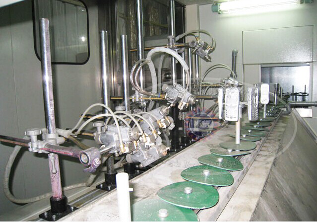 Ω靜電自動(dòng)噴涂設(shè)備,是將輸送軌彎曲成Ω形,工件圍繞圓盤(pán)式靜電噴槍周圍通過(guò),并在噴涂過(guò)程中自轉(zhuǎn),圓盤(pán)噴槍上下移動(dòng)進(jìn)行自動(dòng)噴涂。由于工件圍繞圓盤(pán)噴槍通過(guò),工件相對(duì)噴槍的時(shí)間較長(zhǎng),允許輸送鏈速度較高,故生產(chǎn)效率較高。圓盤(pán)噴槍上下移動(dòng)行程及速度,可依據(jù)工件外形來(lái)調(diào)節(jié),提高涂膜質(zhì)量。