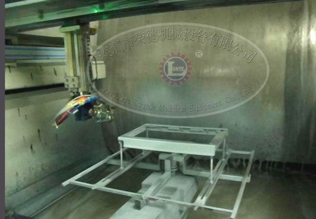 步進(jìn)式輸送,工件 90 度及 360 度旋轉(zhuǎn),附有導(dǎo)向機(jī)構(gòu)實(shí)現(xiàn)初噴時(shí)工件要定位定角度機(jī)器人噴涂。